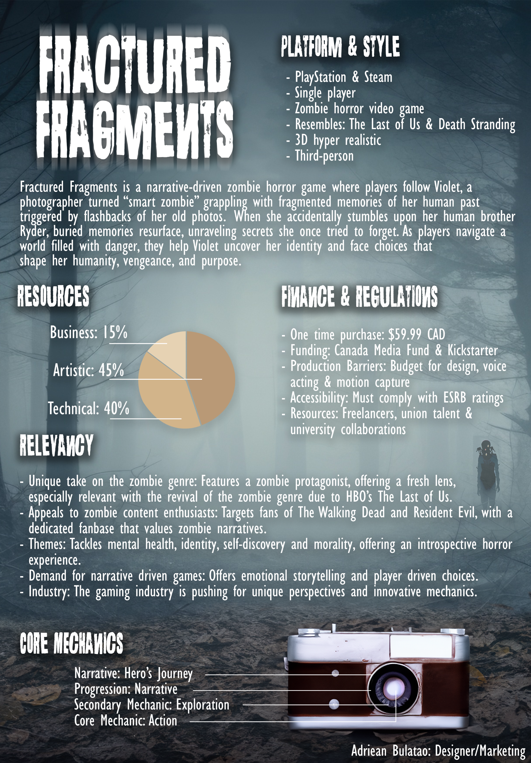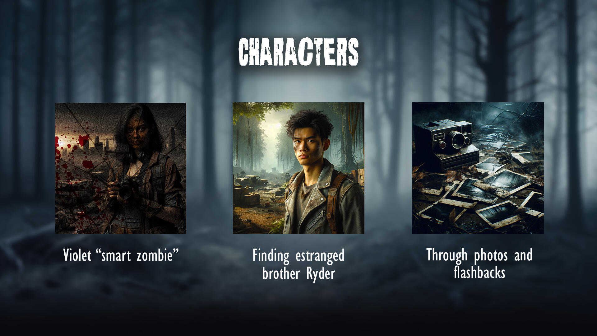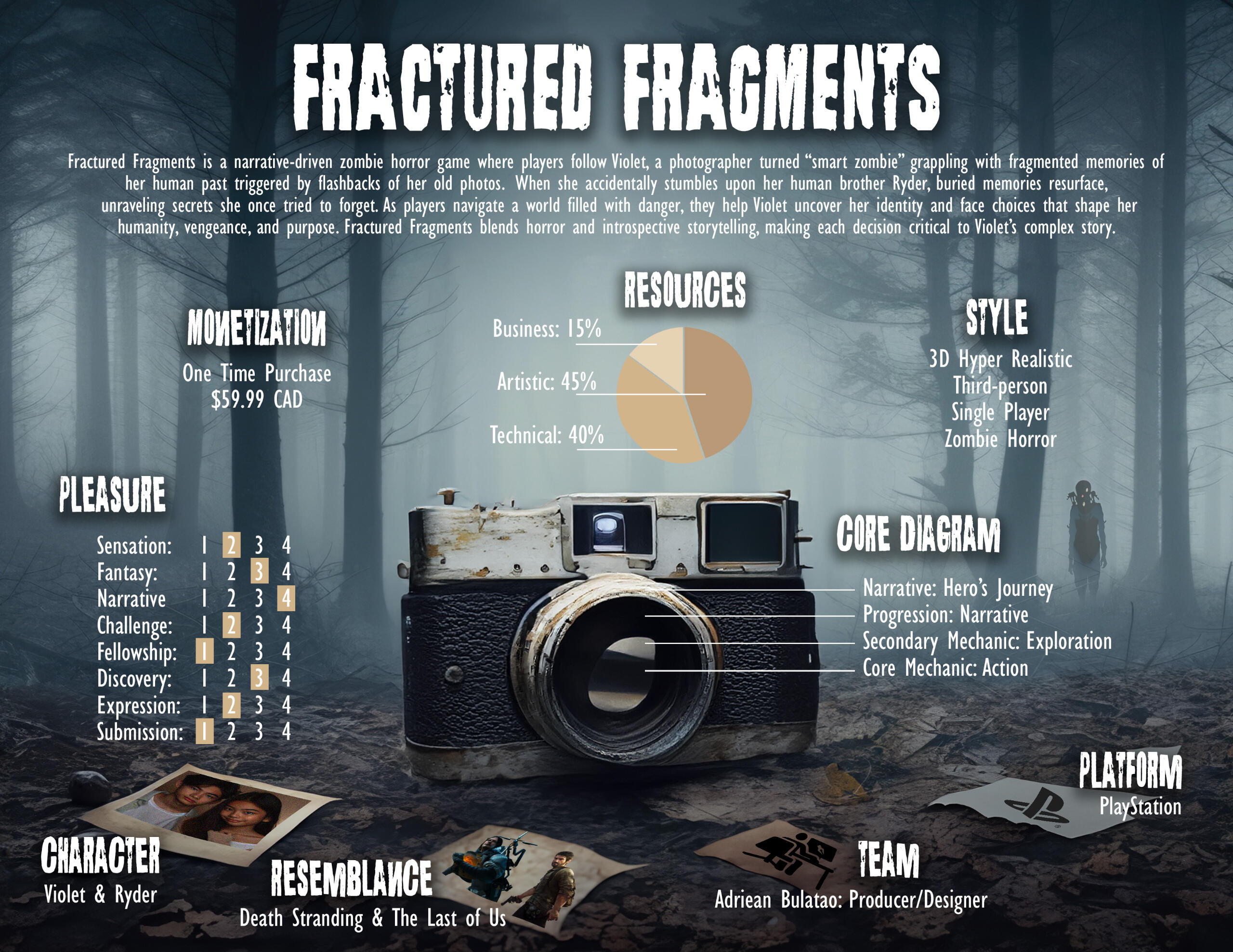 What is Fractured Fragments?Fractured Fragments is a narrative-driven zombie horror game concept where players follow Violet, a photographer turned "smart zombie" grappling with fragmented memories of her past. When she unexpectedly reunites with her human brother Ryder, buried memories resurface, unraveling secrets she once tried to forget. As players navigate a world filled with danger, they help Violet uncover her identity and face choices that shape her humanity, vengeance, or purpose. Fractured Fragments blends horror and introspective storytelling, making each decision critical to Violet’s complex journey.