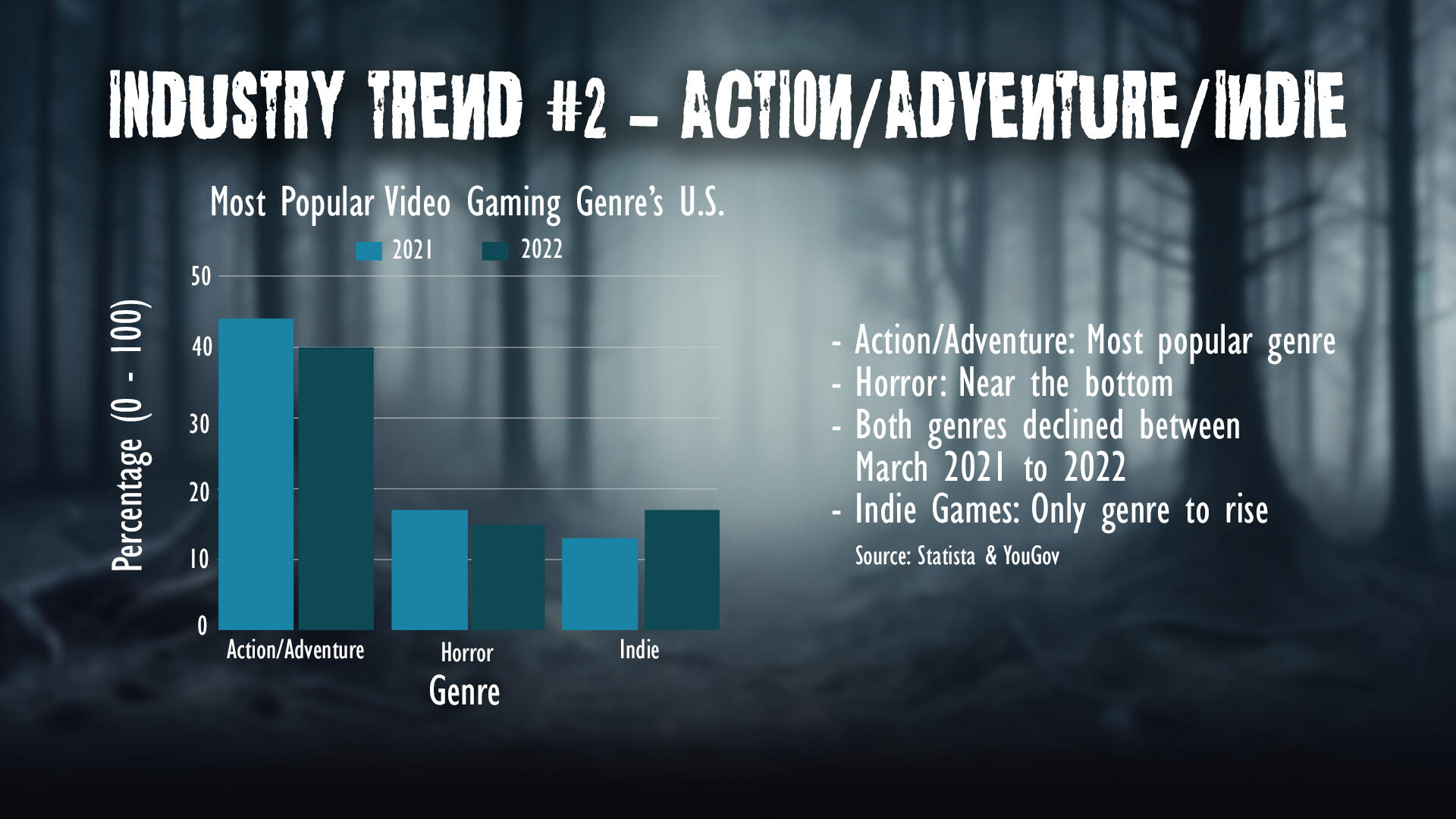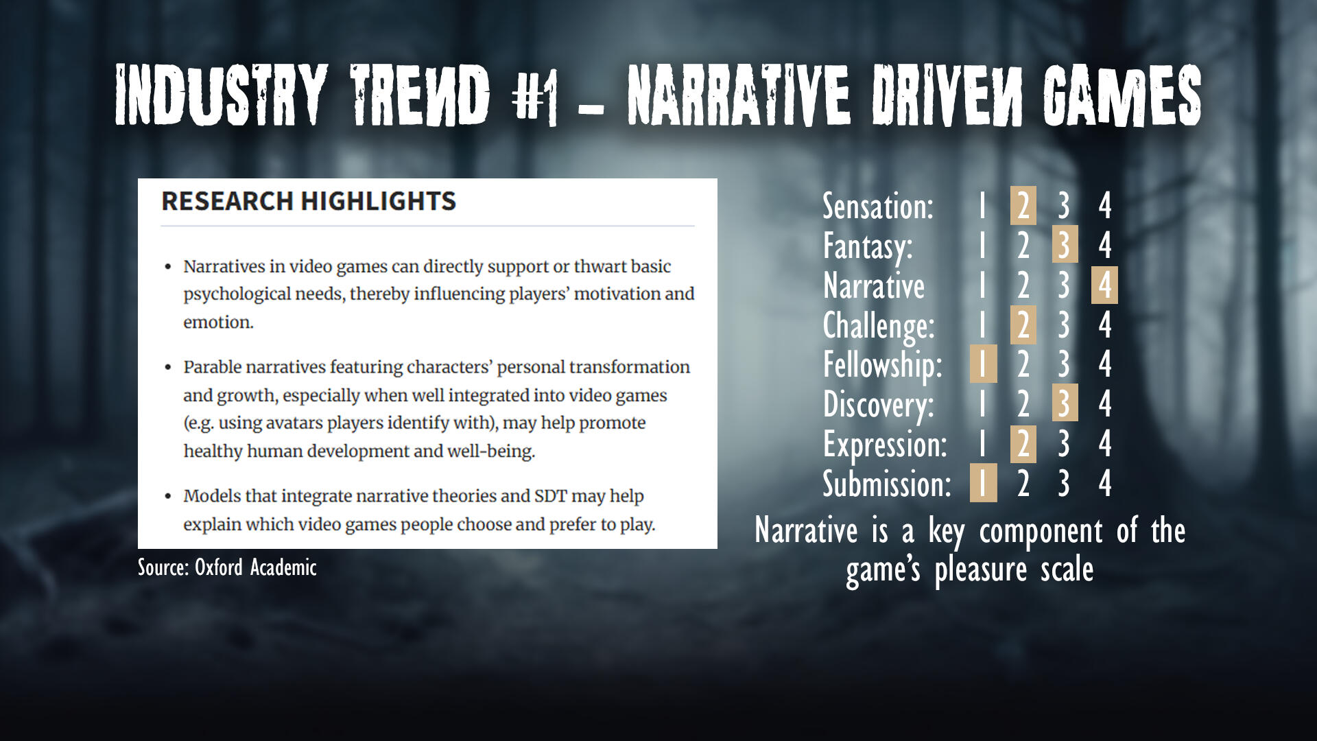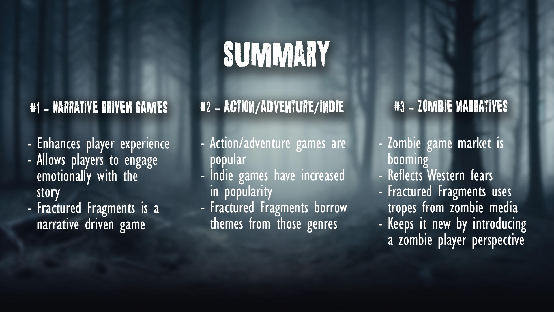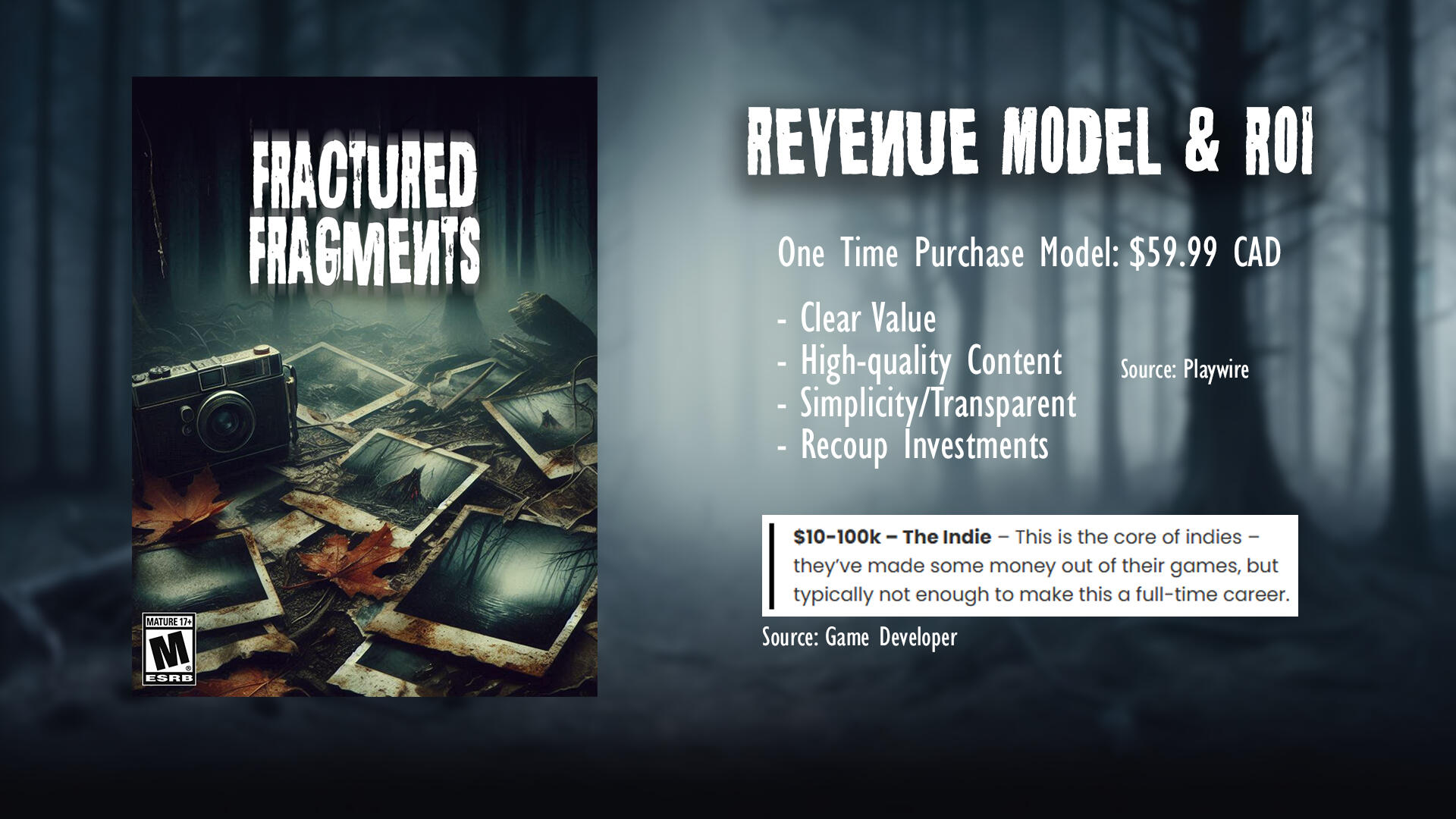 Market AnalysisExamines Fractured Fragments’ position within the horror and indie video game landscape, exploring current genre trends, audience demand, and potential marketability. Highlighting how the game concept aligns with player interests and emerging patterns in narrative-driven gameplay3 Industry Trends Discussed- Narrative Driven Games